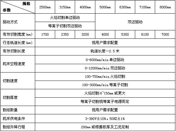 雙頭火焰切割機為龍門式結構,雙頭火焰切割機橫向跨度有3m、4m、5m、6m、8m等多種規(guī)格,雙頭火焰切割機均采用雙邊驅動,雙頭火焰切割機運行穩(wěn)定,雙頭火焰切割機配置好,雙頭火焰切割機工作效率高,雙頭火焰切割機可用于各種碳鋼、錳鋼、不銹鋼等金屬材料的大、中、小型鋼板下料。雙頭火焰切割機還可根據(jù)用戶要求配置多把割炬,或配置成異型切割和直條切割兩用切割方式,另雙頭火焰切割機可選配電容或等離子自動調(diào)高系統(tǒng)。